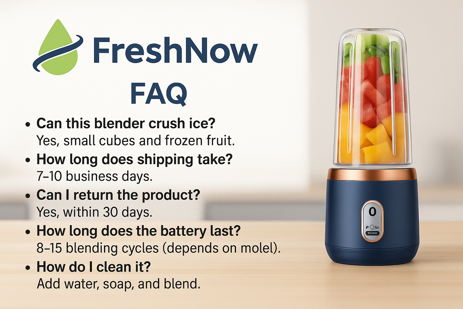 Blends my morning smoothies fast. Battery lasts longer than I expected. Easy to take anywhere.